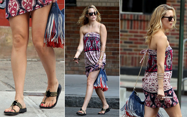 New York, May 14, 2010 - Kate Hudson grabs a bite with a male friend at the Grey Dog in the West Village. As they walk off together it seems Hudson has a wardrobe issue as he holds part of her dress in her hand.